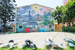 戶外是一整面的眷村場景懷舊彩繪牆,還有戶動彩繪攤販巷