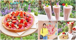 包含香甜繽紛的草莓pizza、草莓牛奶、草莓拿鐵、草莓蛋糕、草莓雞腿排餐等
