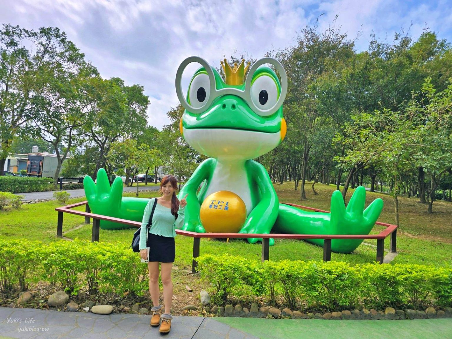 公園內的大青蛙地標是必拍,比人還要高大哦!廣場上還畫著巨大荷葉彩繪~這隻戴著眼鏡還有皇冠,應該就是青蛙王子造型吧!