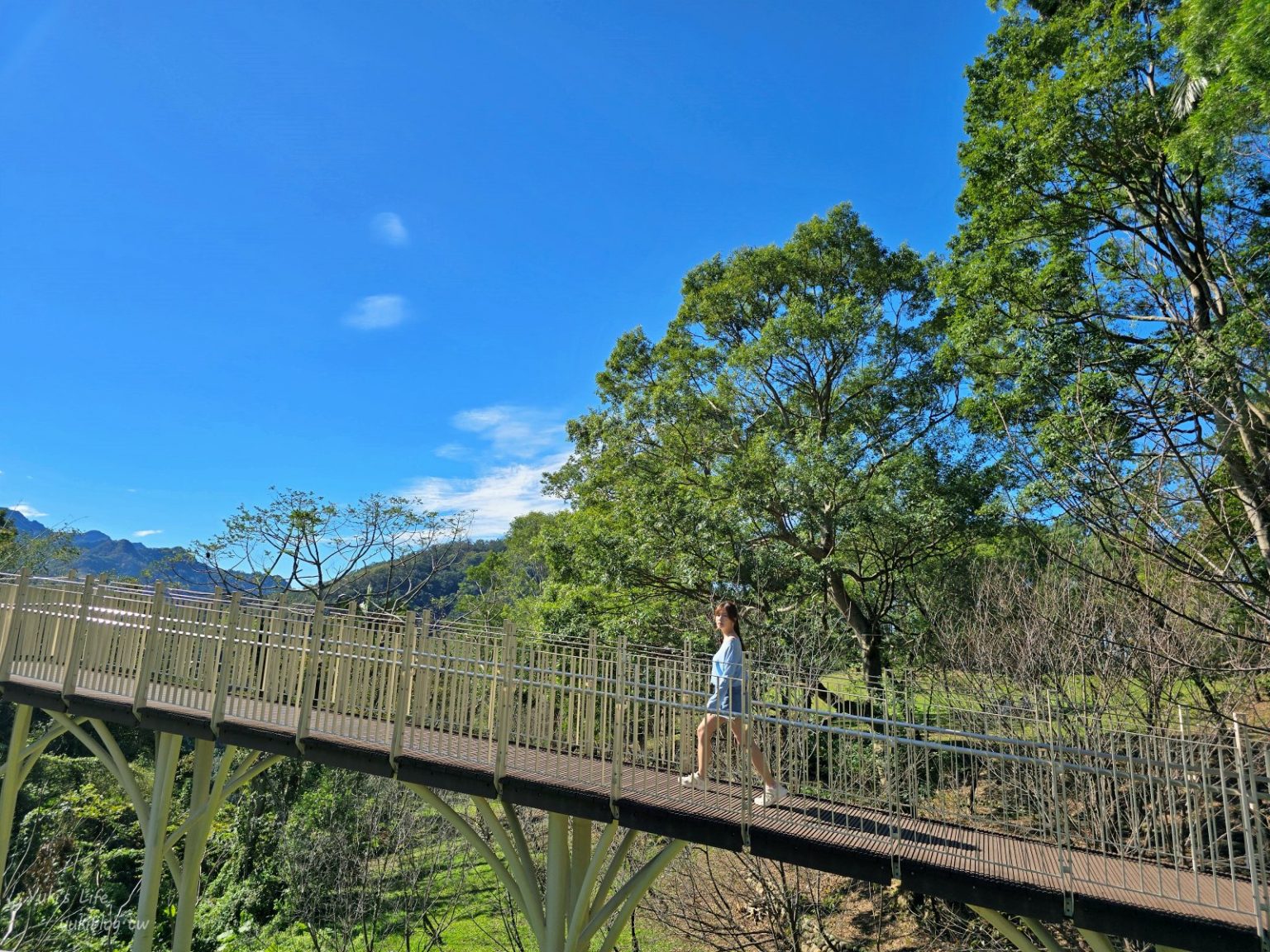 從南入口進來的話,可看到角板山行館的天空之橋,天空之橋採用木頭色和乳白色的搭配,非常有氣質,被大自然包圍的天空之橋顯得相當浪漫,拍照的效果100分