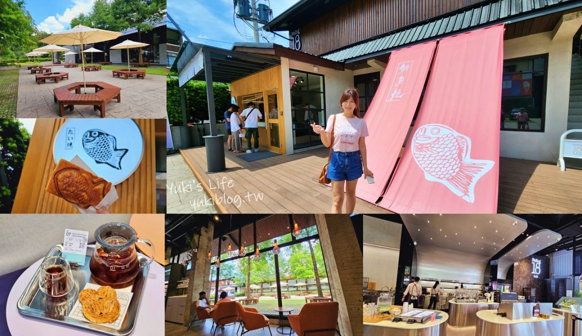 停車場旁邊就是Feeling 18 LAB 烘研所的戶外空間,大大的紅色帷畫上鯛魚燒的圖案和字樣,建築樣貌再搭上周圍的露天座位區,感覺來到了日式庭園